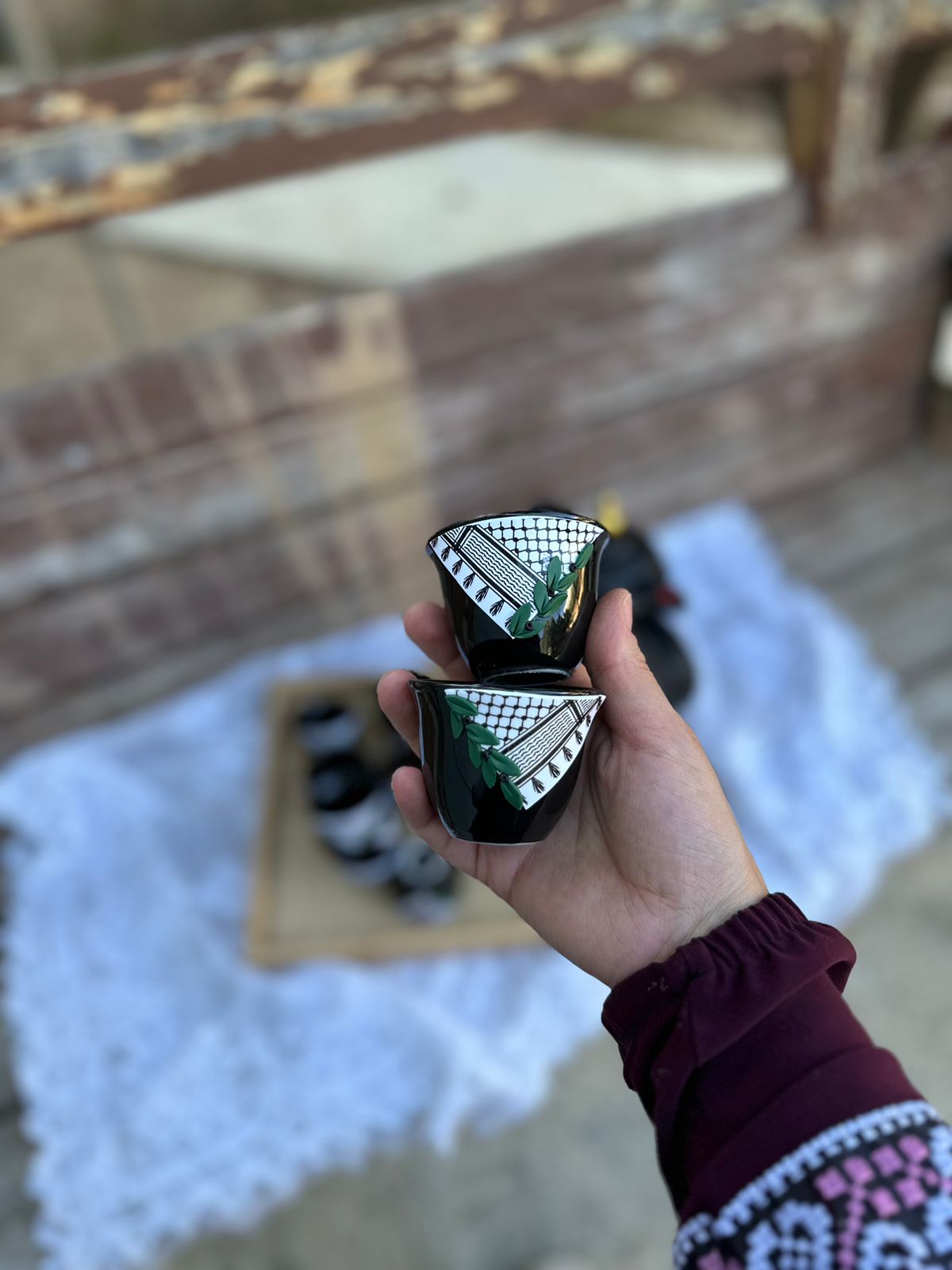 تسوق الآن طقم فناجين القهوة العربية المصنوعة يدويًا من الصلصال الحراري. تصميم يعكس جمال التراث الفلسطيني. متوفر في متجر مزيج مع خدمة التوصيل لجميع الدول.
