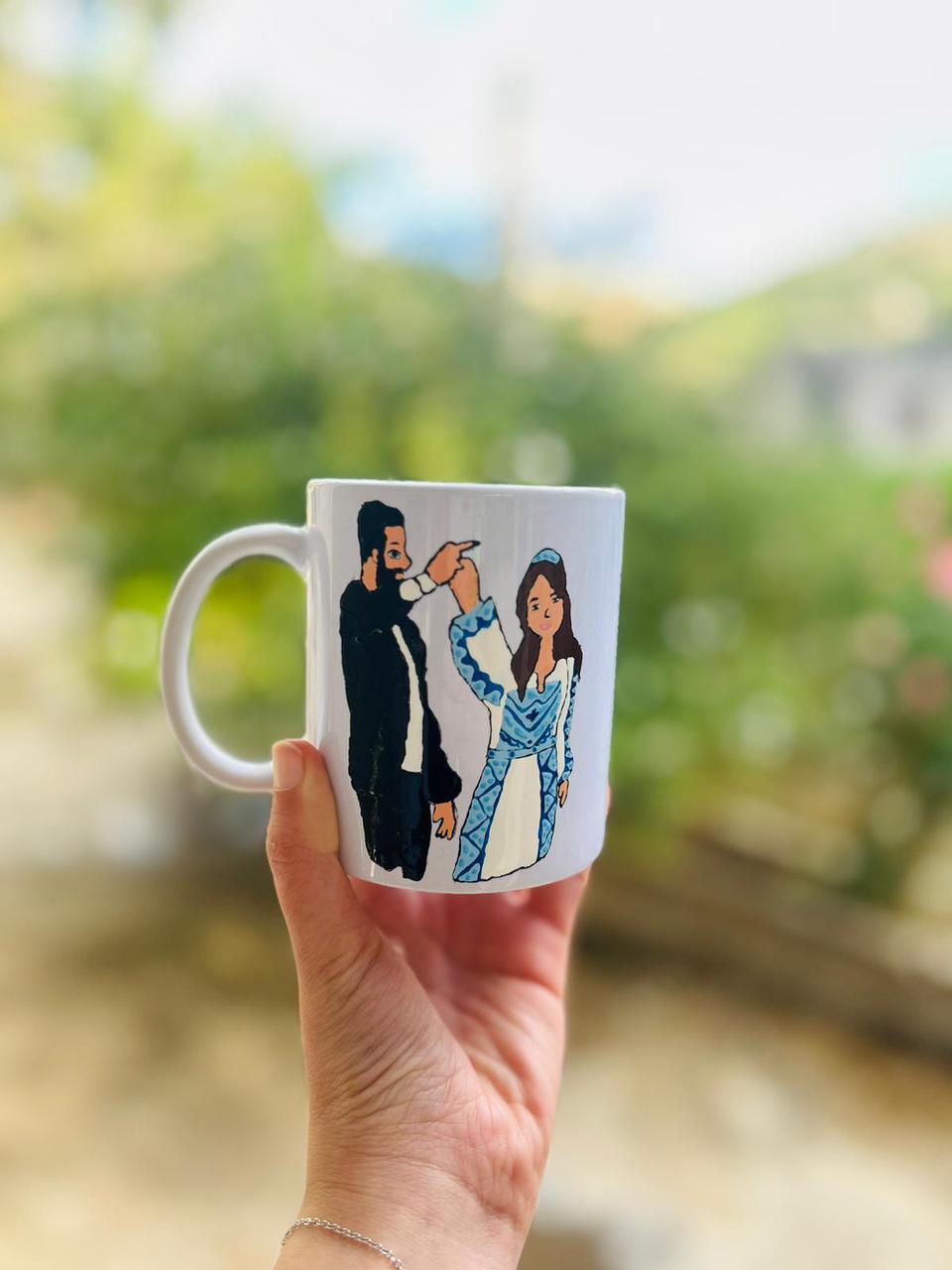 كوب مصنوع يدويًا ومزين برسمات فنية مستوحاة من التراث الفلسطيني العريق. كل تفصيلة على الكوب تحكي قصة من