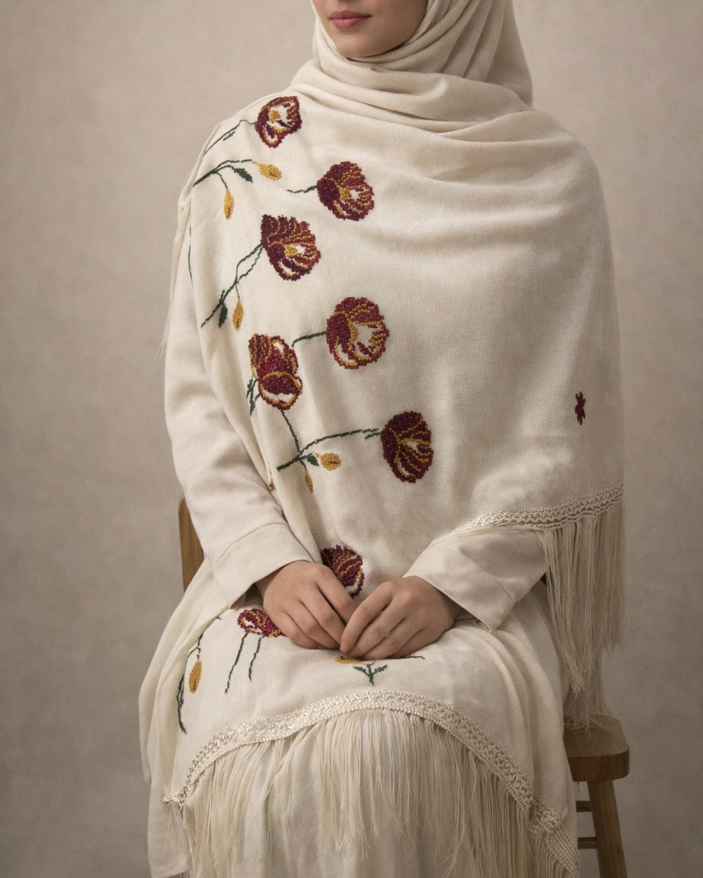 This embroidered shawl tells a story of authentic Palestinian heritage.